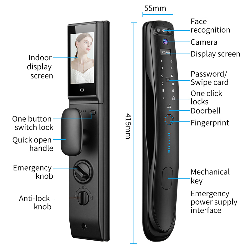 QLEUNG Smart Lock with 3D Face Recognition, fingerprint, RFID card, PIN, and Tuya video calling.