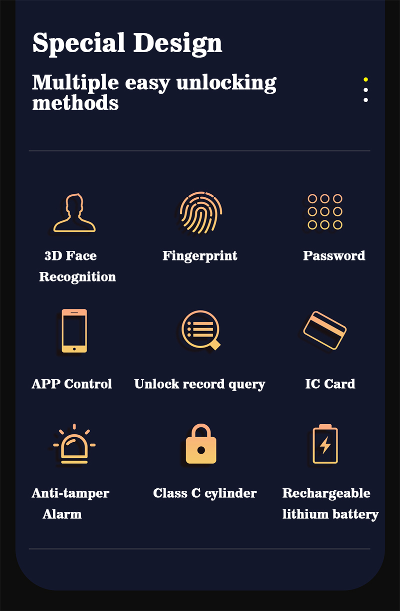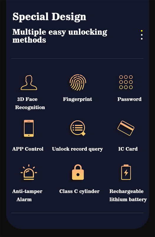 | Métodos de desbloqueio: | Tuya wifi, senha, impressão digital, cartão, chave | Peso: | 6 kg/pcs |